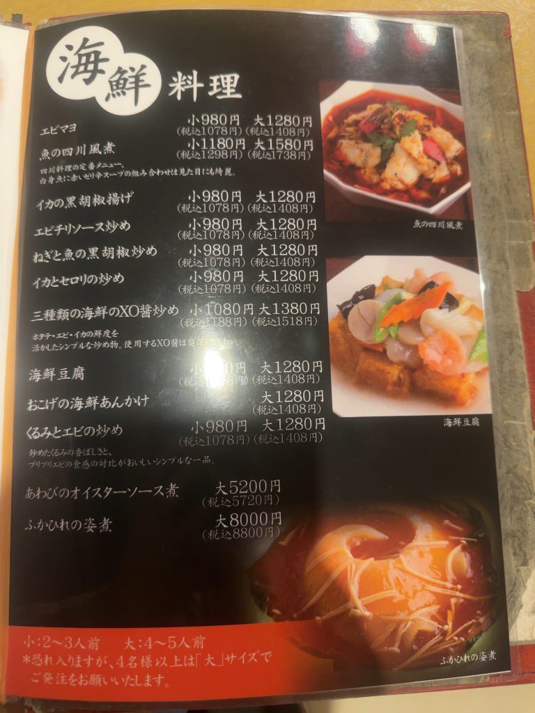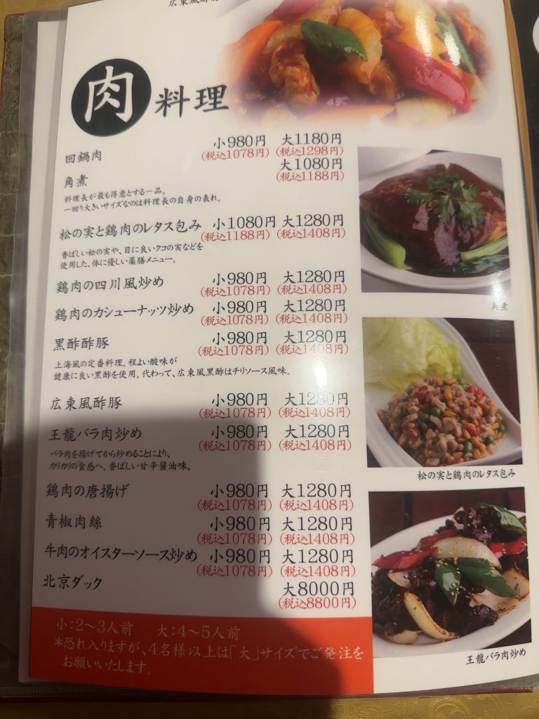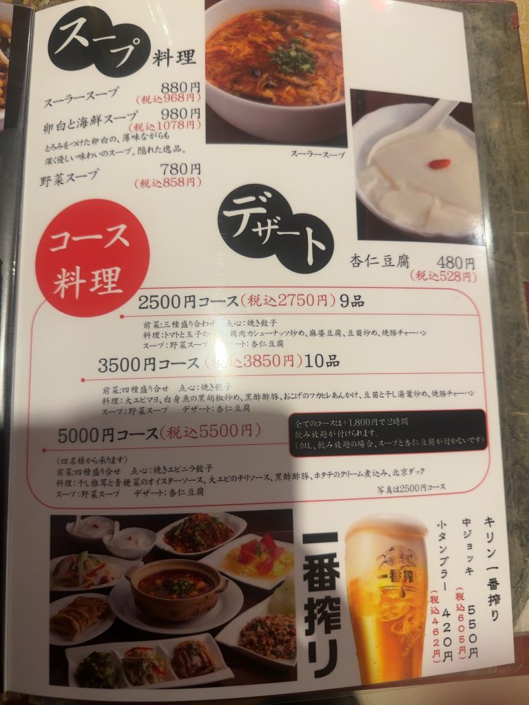 メニューは前菜、点心、野菜、肉、海鮮、ご飯、麺類、スープ料理、デザートと非常に種類豊富だ。宴会向けのコース料理も用意されている。