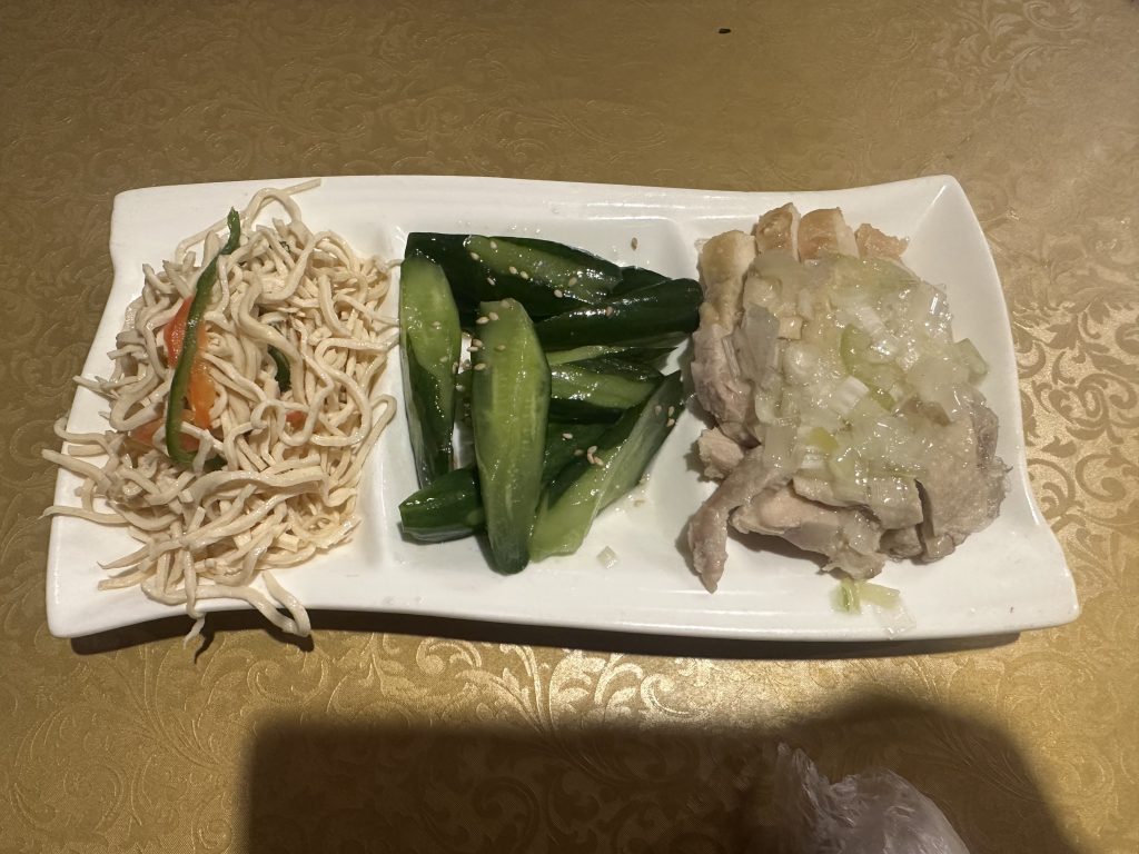 鶏肉のネギソースはあっさり塩ベース。歯応えあって美味しい。