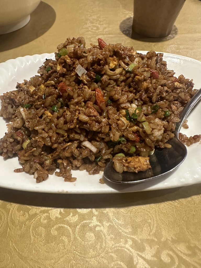 王龍チャーハンは、中国のたまり醤油を使用した、真っ黒なチャーハンが見た目の特徴のチャーハン。