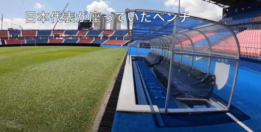 ピッチを正面に見て右のベンチが当時の日本代表側のベンチだ。