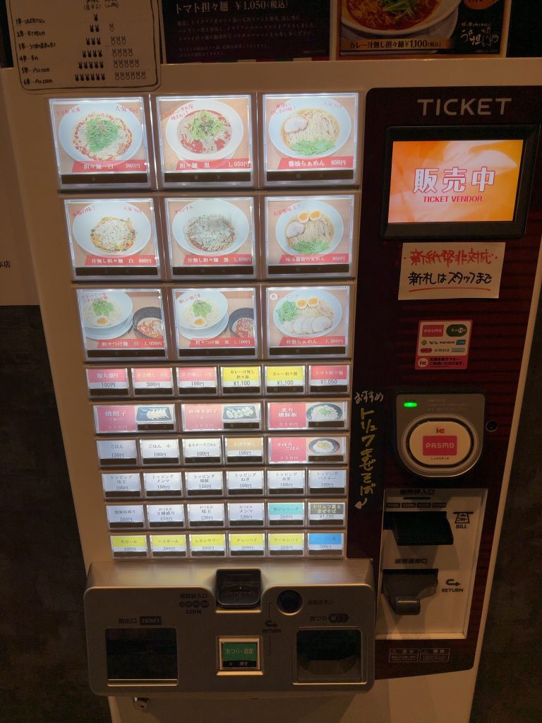 券売機はSuicaなど電子マネーにも対応しており、食券をカウンターで店員さんに食券を渡すシステムとなっている。