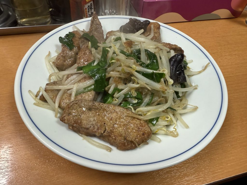 もやしとニラのたっぷり入ったシャキシャキの炒め物に、肉厚で柔らかなレバーが絡む。