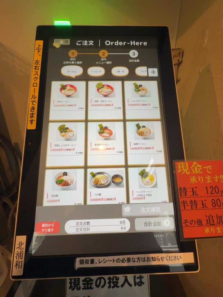 注文はお店の入口を入って右にある券売機で注文を行う。支払は現金のみとなっている。