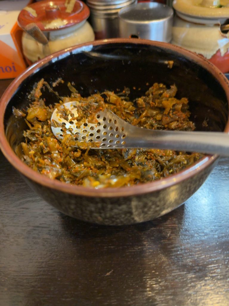 卓上に置かれた高菜は、控えめの塩味と甘辛さのバランスがちょうどいい。ラーメンに少しずつ加えると、味変としても楽しめる。