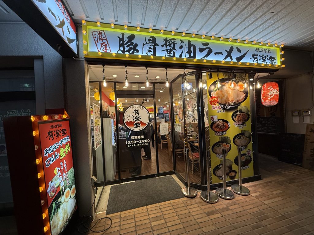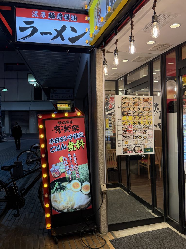浦和駅西口の目の前にある浦和コルソ裏のパチンコ店「ラカータ」と「セブンビル」の間を進むこと20メートルの左手に現れるのが、今回訪れた2025年3月15日にオープンしたばかりの家系ラーメン店「有楽家 浦和駅西口店」だ。