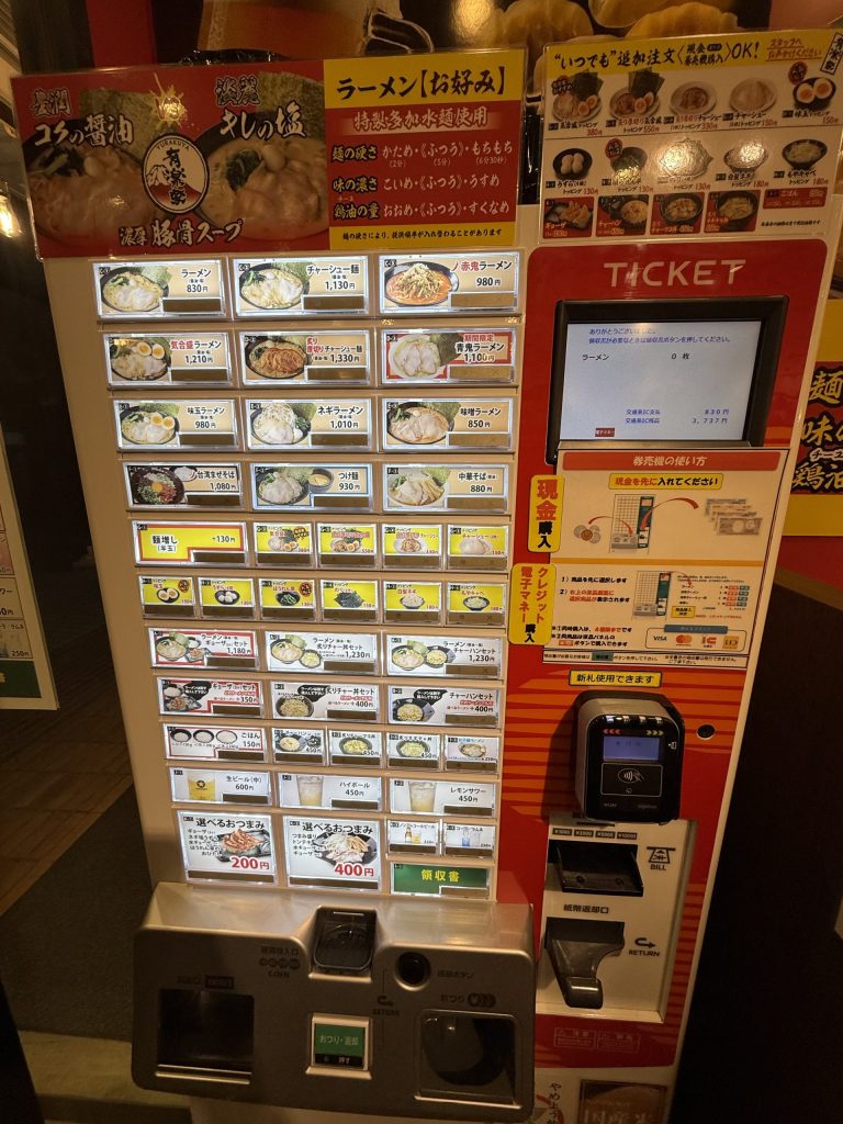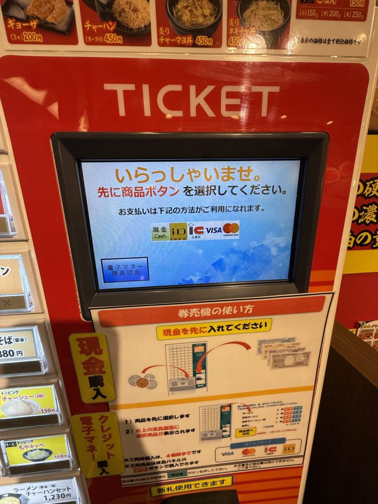 注文は券売機でサクッと食券を購入するスタイルで、支払い方法は現金はもちろん、電子マネーやクレジットカードなどにも対応しているのが嬉しいポイント。