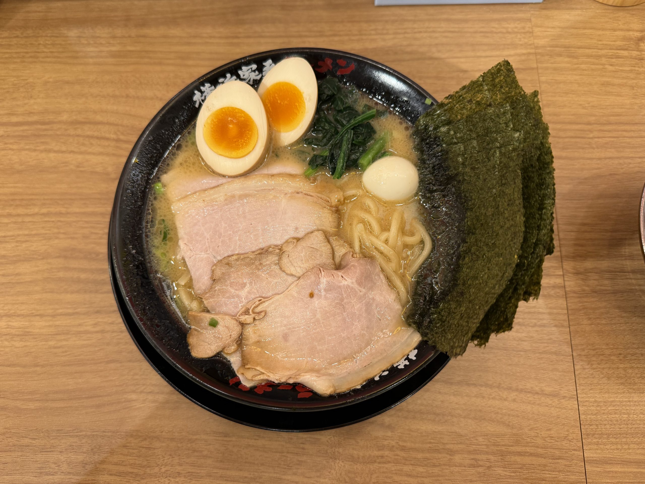 運ばれてきたラーメンには薄切りチャーシュー4枚に、味玉、うずらの卵、ほうれん草、そして家系の象徴ともいえる大判の海苔が5枚。