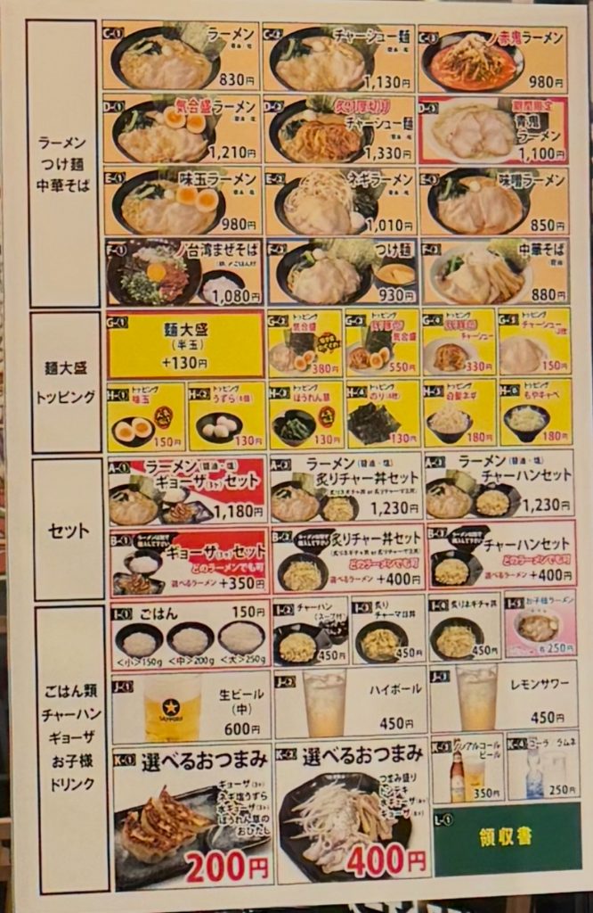 | 200円:ギョーザ3個、味玉、うずら5個、もやしナムル | 200円 |