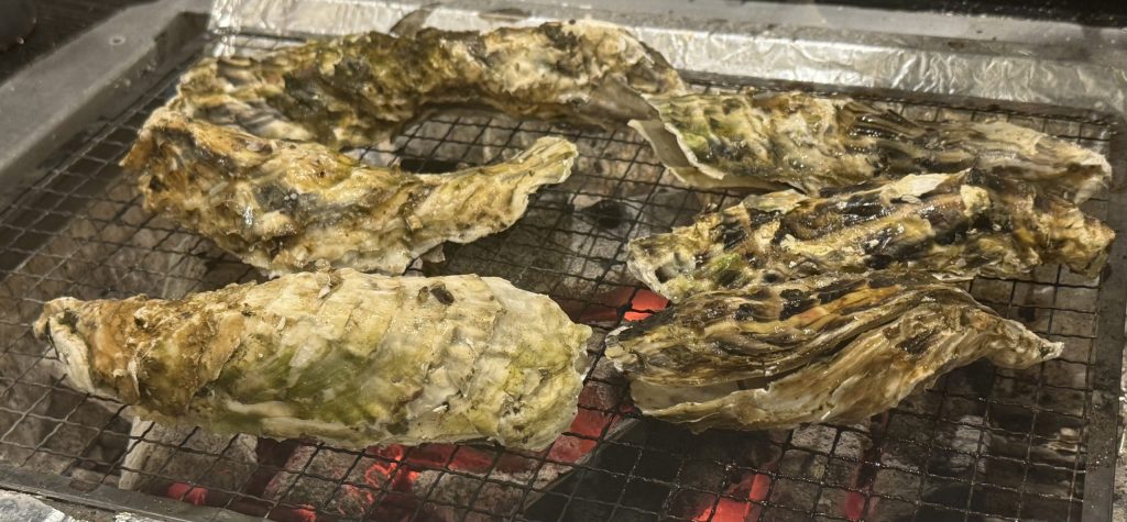 焼きたての牡蠣を口にすれば、ぷりっぷりの身からじゅわっと広がる磯の旨みがたまらない。殻付きのまま豪快に炙るスタイルもまた風情があっていい。