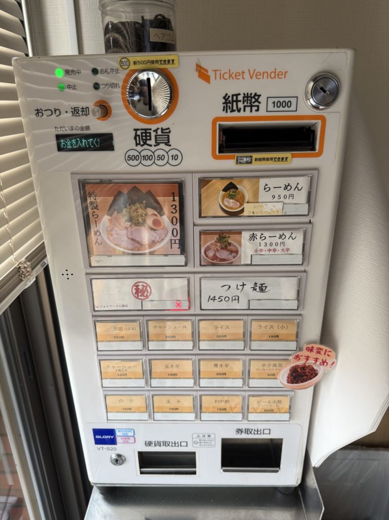 注文は入口左の食券を現金で購入する方式だ。定番は豚骨醤油ラーメン。